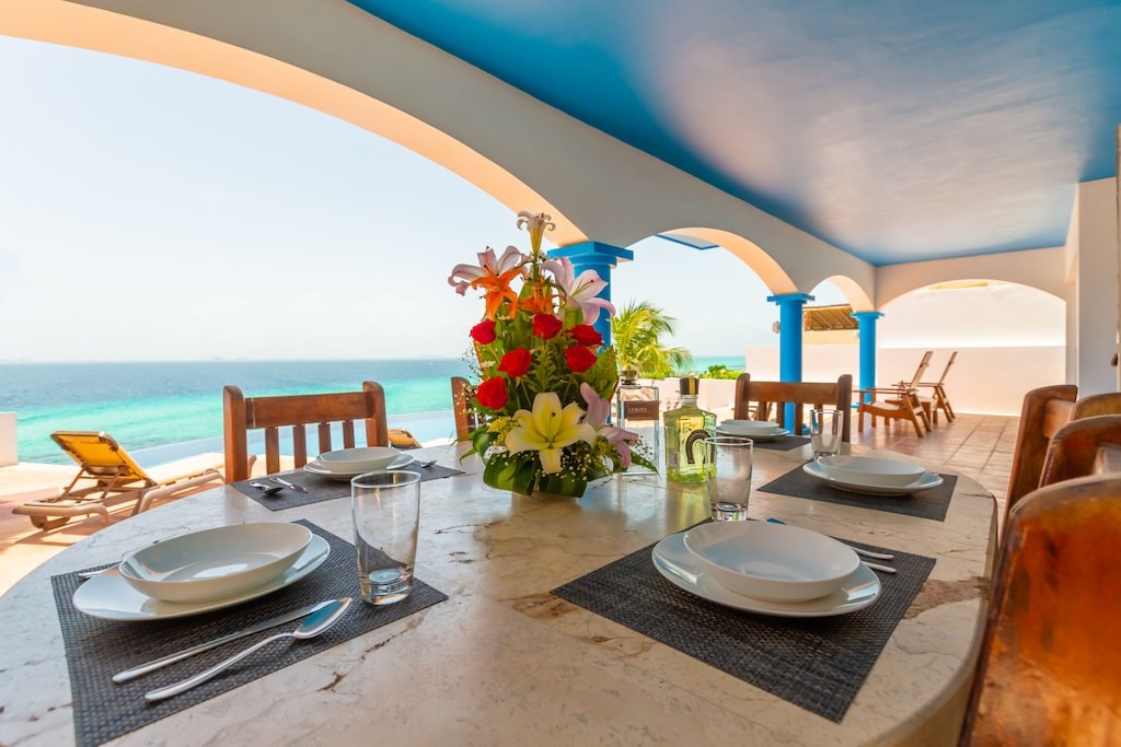Isla Mujeres' Finest Oceanfront Home Special Summer Rates!, Beautiful House rental in Isla Mujeres has 4 bedrooms, 4.5 bathrooms, 8 sleeps, 1 minimum stay House for rent in Isla Mujeres Quintana Roo with the amenities and near by attractions , Air Conditioning, Children Welcome, Exterior lighting, Fire extinguisher, Garage, Internet, Kitchen, Linens Provided, No parties/events, No Pets Allowed, No Smoking, Oceanfront, Parking, Private Pool, Smoke detector, Swimming pool, Towels Provided, Washing Machine, Water View, Waterfront, Wireless Internet, Basic Soaps, Cable/Satellite TV, Clothes Dryer, Coffee Maker , Dishes & Utensils, Dishwasher, DVD Player, First-aid kit, Hair Dryer , Iron & Board , Microwave, Outdoor Grill, Oven, Refrigerator, Stove, Telephone, Television, Toaster, Toilet Paper, Washer/Dryer Travel crib, Pantry Items(some spices available), Books, Stereo, Video Library, Music Library, Deadbolt lock, Safe, Downtown, Concierge, Housekeeper Included, Minimum Age Limit for Renters 21